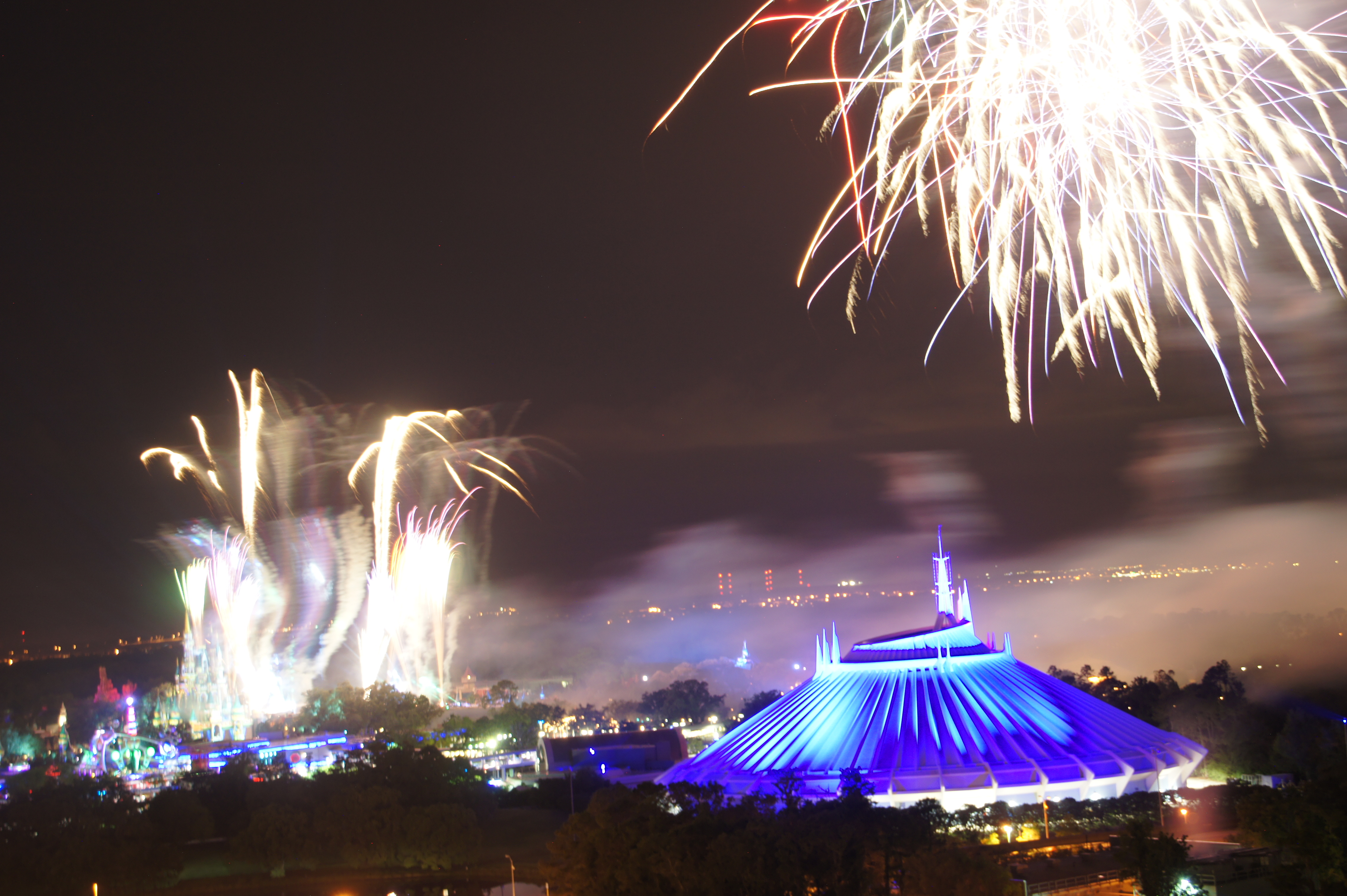 We watched the show again from our balcony at Bay Lake Tower on the last night of our trip. One of the channels on the TV will play the audio so you’re synced up with the show. I really liked watching it from that angle; it’s fun to get the different perspective on those shows from different viewpoints. Of course, from that angle and distance you cannot see most of the projections on the castle–and that’s where a LOT of the action is with this particular show. When you are in front of the castle, it looks like all the fireworks are being shot off from RIGHT behind the castle, doesn’t it? Interestingly, when you watch the show from Bay Lake Tower or the Contemporary, you can see that most of the fireworks are shot off from quite a distance away.