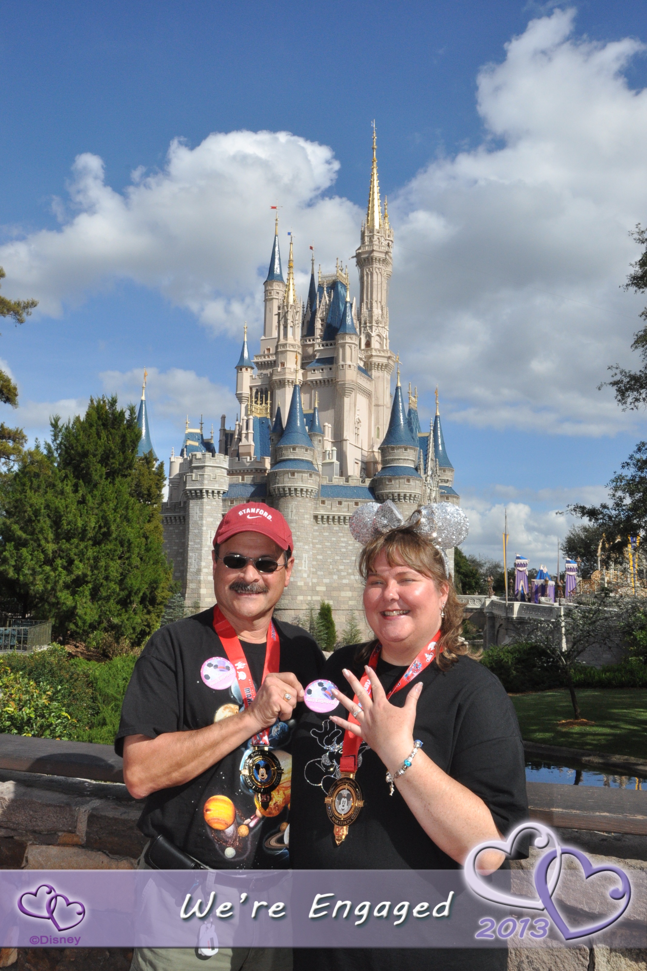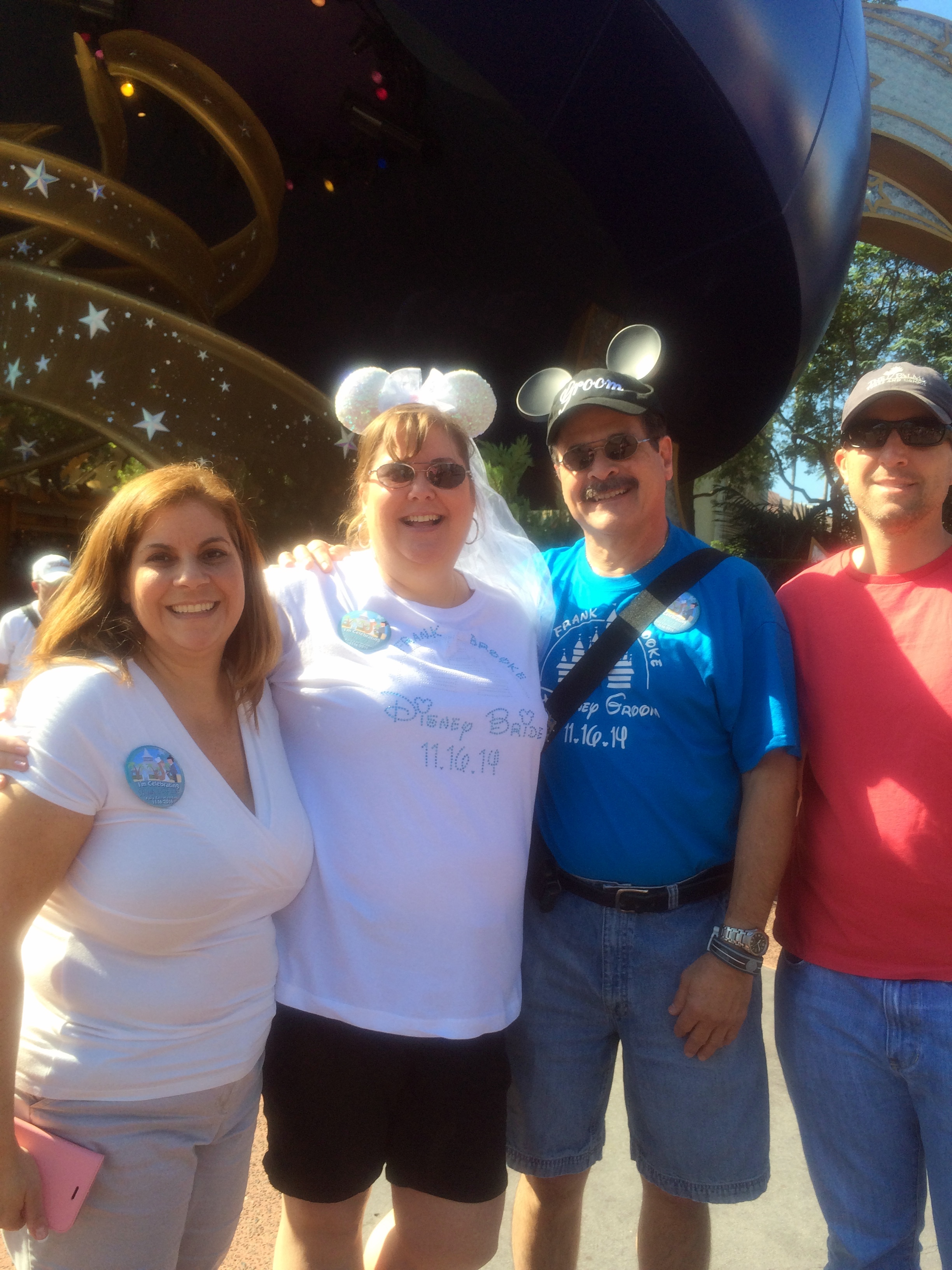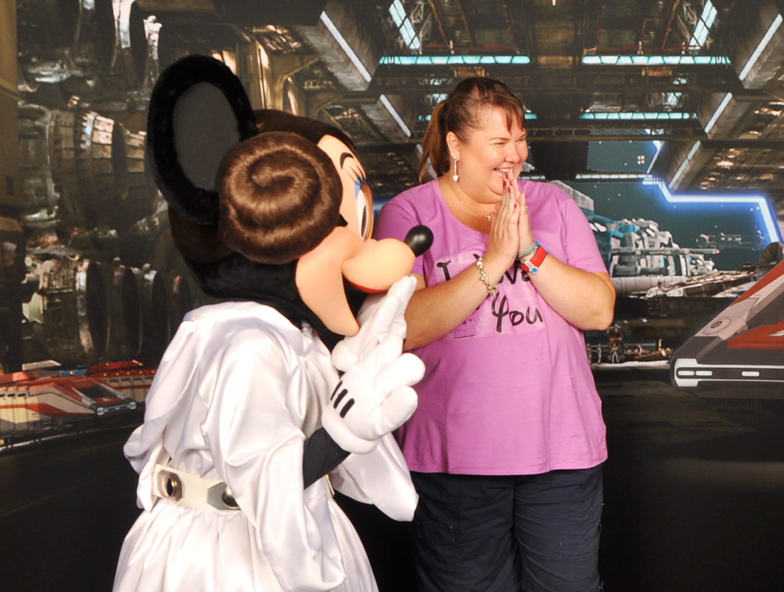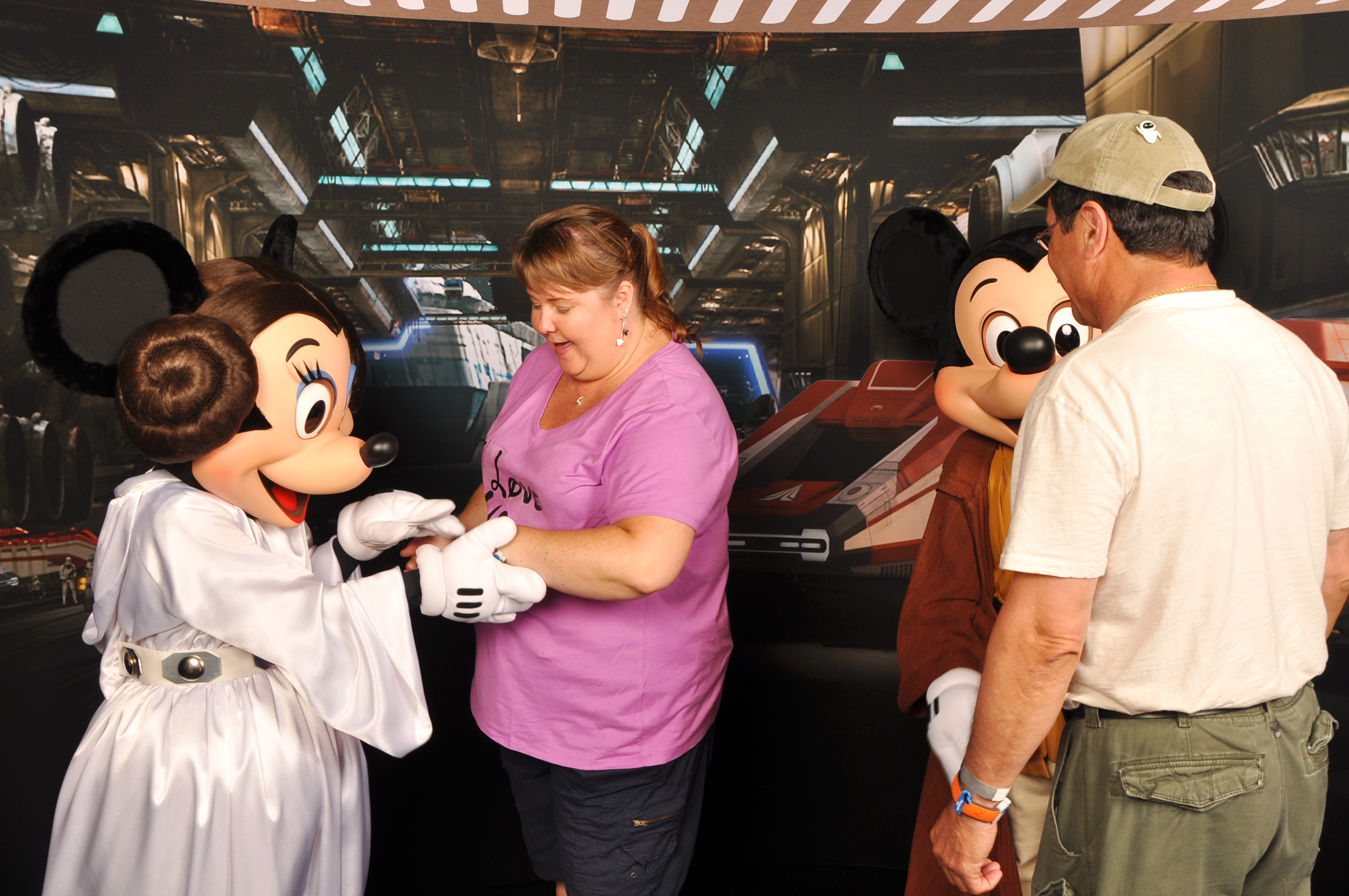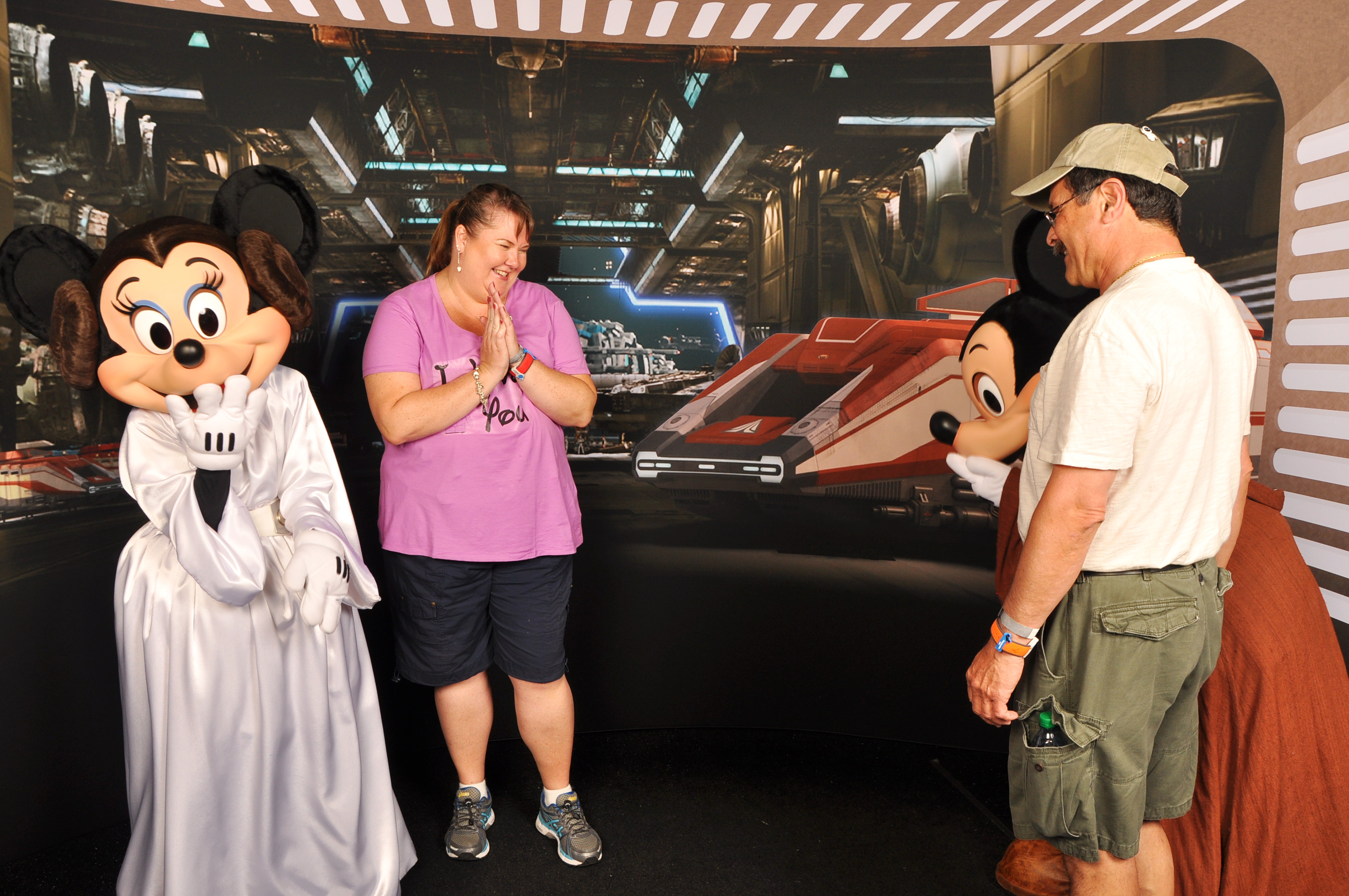 Our favorite character greeting (so far) was at a Star Wars weekend in May 2014. We were at Disney that weekend primarily for our Disney Wedding planning session, but were OF COURSE not going to miss out on some park time 😉! Before the trip, I’d made some shirts with some iron on decals (I learned from this project that I am not really a fan of the iron-ons, I must be honest) specifically for our Hollywood Studios day, in honor of Star Wars weekend. Mine featured Princess Leia Vinylmation, and said “I love you” and Frank’s featured Han Solo Vinylmation, and said “I know”. We did the Character Greeting with Star Wars Minnie and Mickey and they really played up our shirts which was awesome, and then Minnie saw my ring and went a little crazy and the whole thing was just hysterical. She was pretending to be mad at Mickey because she didn’t have a ring, and Mickey was hiding behind Frank at one point…at any rate, it was a really memorable greeting, and we both loved it!