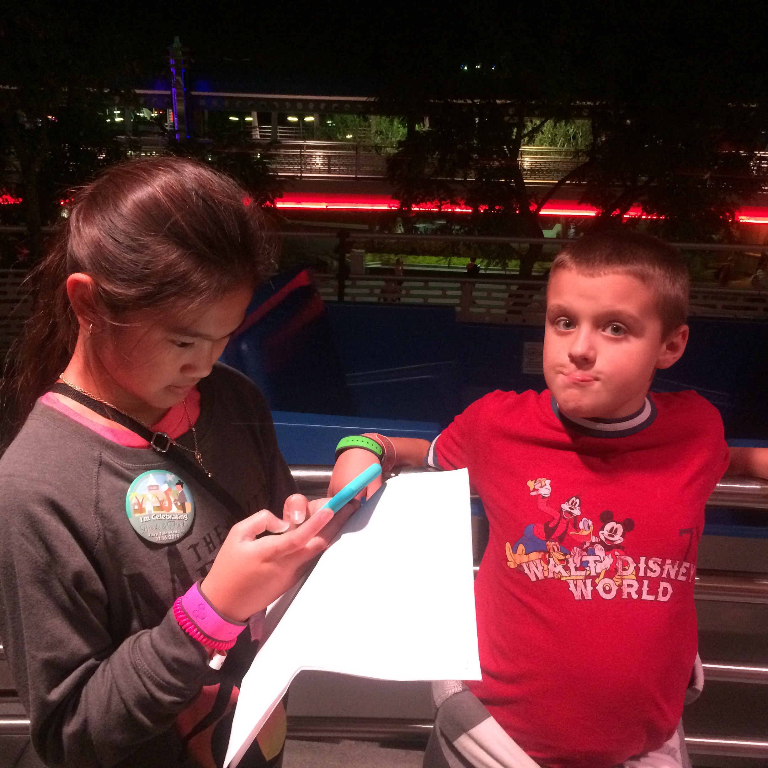 Still another idea is just to meet for a Photopass picture periodically. For example, suggest everyone meet at the Partner’s statue at 1:15pm to check in. You take a big group picture, see how everyone is doing, and then everyone goes on about their day.